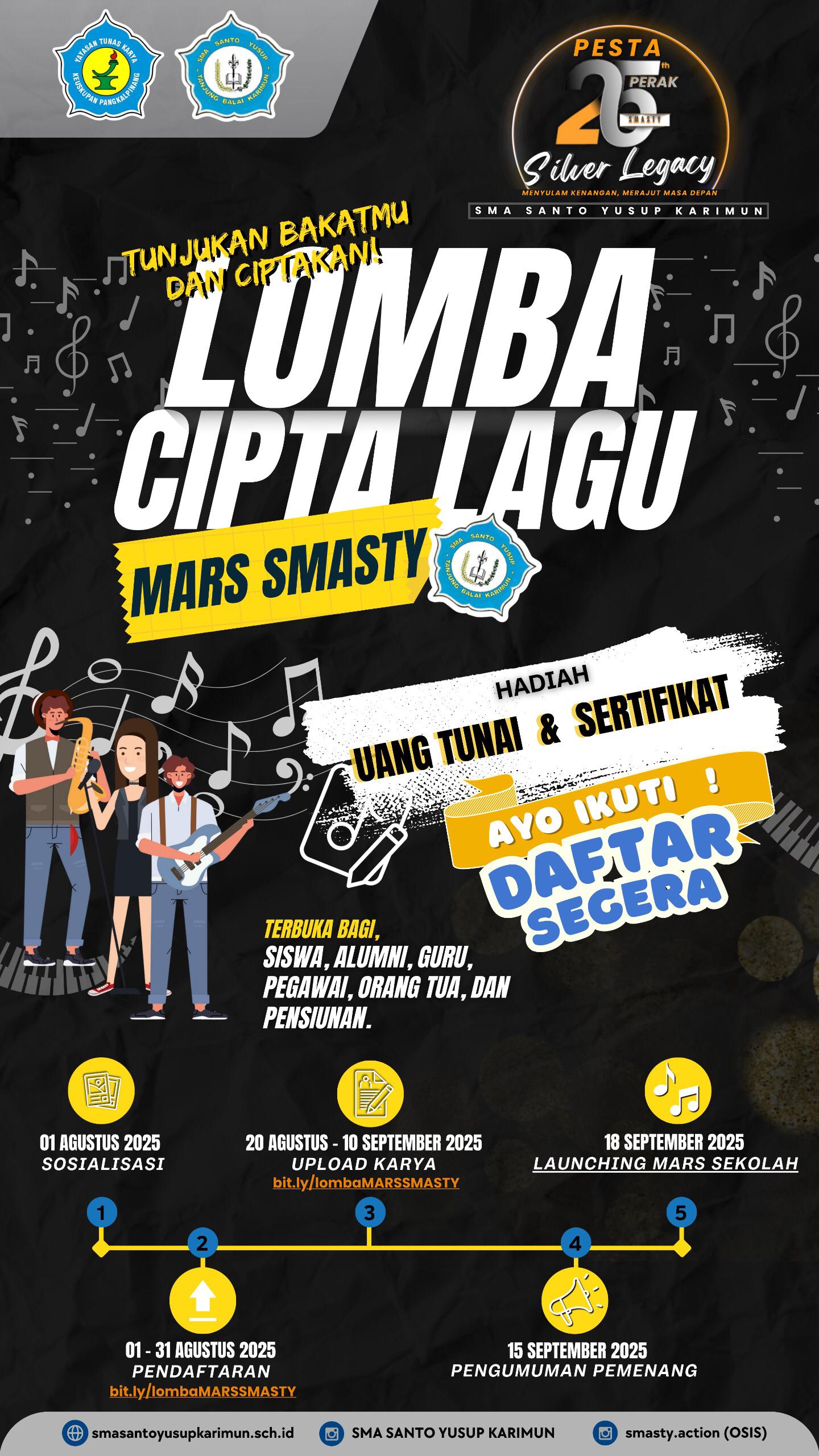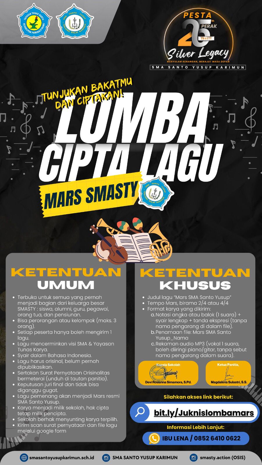 LOMBA CIPTA LAGU MARSOleh admin / Agustus 26, 2025 lomba khusus bagi Alumni, pensiunan, dan yg masih aktif bersekolah dan guru, karyawan SMA Santo Yusup.